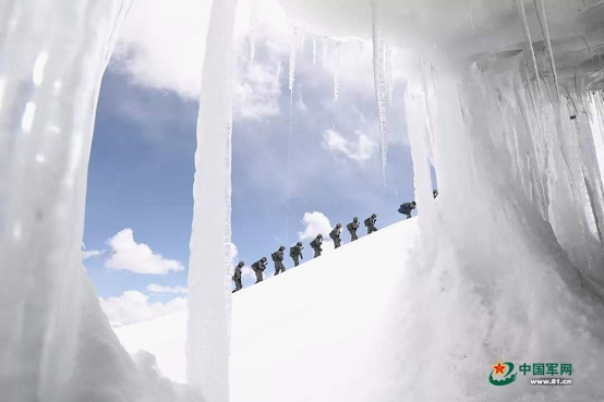 端午节期间,新疆军区克克吐鲁克边防连官兵在海拔5400米的冰川上巡逻。冰川很美,但美得恐怖,行走在冰川之上,官兵们都要小心翼翼、谨慎挪步,怕一声呐喊招致雪崩。我蹲在冰窟里,头顶着倒挂的锋利冰溜子,抓拍下了战士们爬坡的画面。