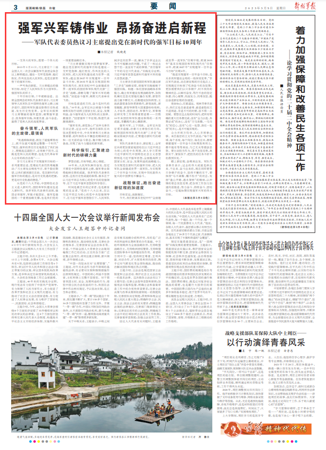 习主席亲自谋划国防和军队建设新“三步走”战略安排,使强军实践植根于强国实践。构建一体化国家战略体系和能力,确立我军建设发展战略指导,加快机械化信息化智能化融合发展,新型作战力量不断壮大,后勤建设加快转型,主战武器装备加快更新换代,新型战机、新型舰艇、新型导弹等大国重器纷纷亮相,人才培养、国防动员、军事外交、军事理论研究等工作取得重要进展……历数10年来国防和军队建设取得的一系列成就,李鹏程代表心潮澎湃。