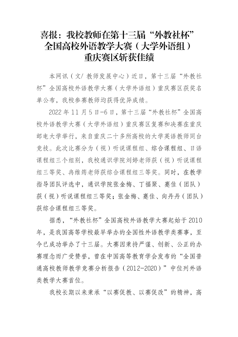 喜报:我校教师在第十三届“外教社杯”全国高校外语教学大赛(大学外语组)重庆赛区斩获佳绩