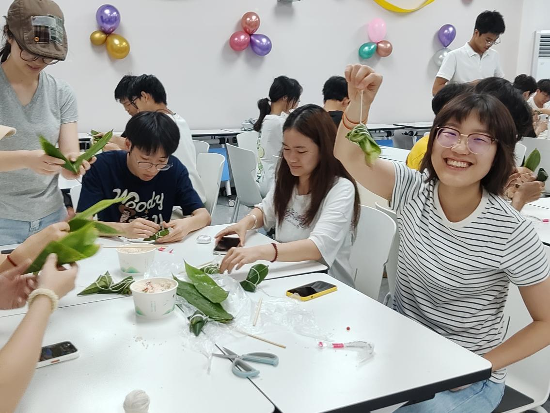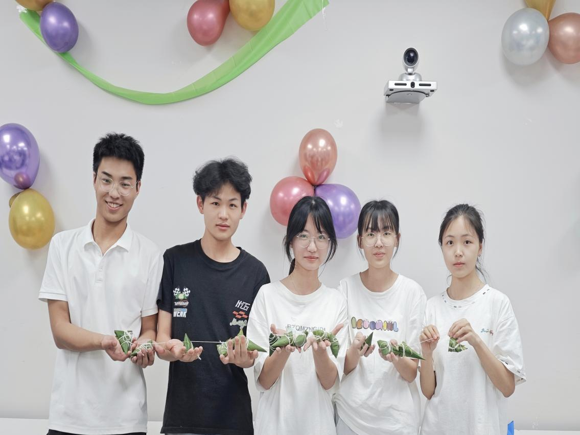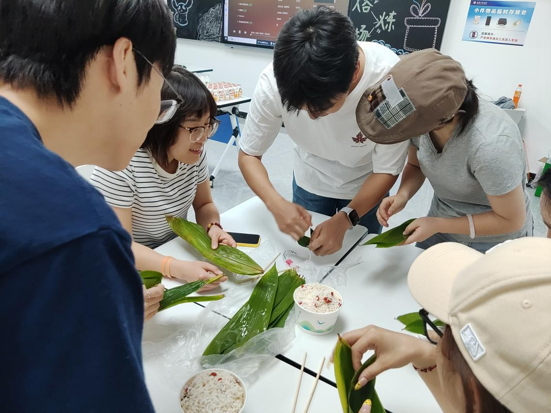“协作之韵”环节中,同学们分成4-6人一组进行包粽子比赛。在限时20-30分钟内,各小组成员紧密配合、分工明确,有的负责准备粽叶,有的负责装米,有的负责包裹,还有的负责捆绑。尽管遇到诸多问题,但通过相互交流学习,最终成功完成任务,锻炼了团队协作能力,增进了友谊,也感受到了传统美食文化的魅力。