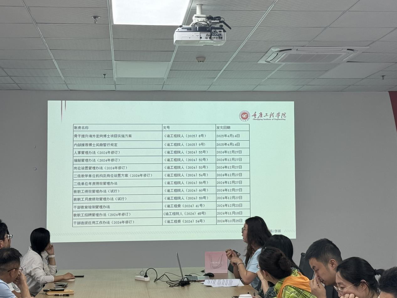 学院办公室副主任江丽娜阐明会议对教职工明晰人事政策、规范学院管理的重要意义,强调制度遵守的必要性,鼓励全体教职工工持续关注学校各类规章制度的更新。随后,她按照制度发布时间顺序,先对 2024 年修订的一系列制度,如人事、编制、岗位管理等办法,详细解读修订要点与执行要求;接着介绍 2025 年新出台的骨干提升海外定向博士项目方案及内部推荐博士奖励规定等。