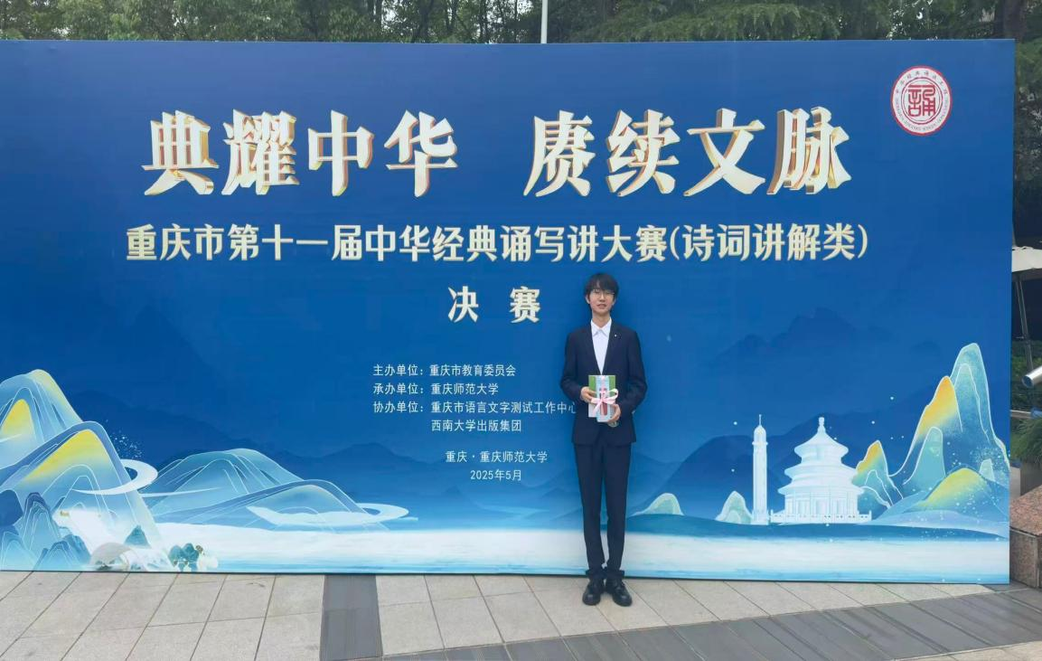 本次大赛由重庆市教育委员会、重庆市语言文字工作委员会主办,旨在传承和弘扬中华优秀传统文化,提高学生的语言文字应用能力和文化素养。大赛吸引了众多高校和中小学的优秀选手参赛,竞争十分激烈。胡漫同学在备赛过程中,与团队默契配合,深入钻研诗词内涵,反复打磨讲解内容和表达方式。在比赛现场,他凭借对诗词的深刻理解、生动形象的讲解以及自信大方的台风,赢得了评委们的一致好评,最终斩获一等奖。