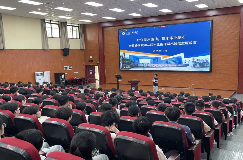 本网讯(图/文 大数据与人工智能学院 傅沙沙)为落实《重庆工程学院关于做好2026届本科毕业设计(论文)工作的通知》(教函〔2025〕127号)精神,弘扬科学精神,强化学术诚信意识,夯实毕业设计质量根基,10月10日下午14:00时,大数据与人工智能学院在南泉校区7807报告厅召开2026届毕业设计(论文)学术诚信主题教育讲座。学院教学副院长廖宁、教务科、2026届毕业设计指导教师及2026届毕业学生共计400余人线上线下同步参会,会议由廖宁副院长主持。