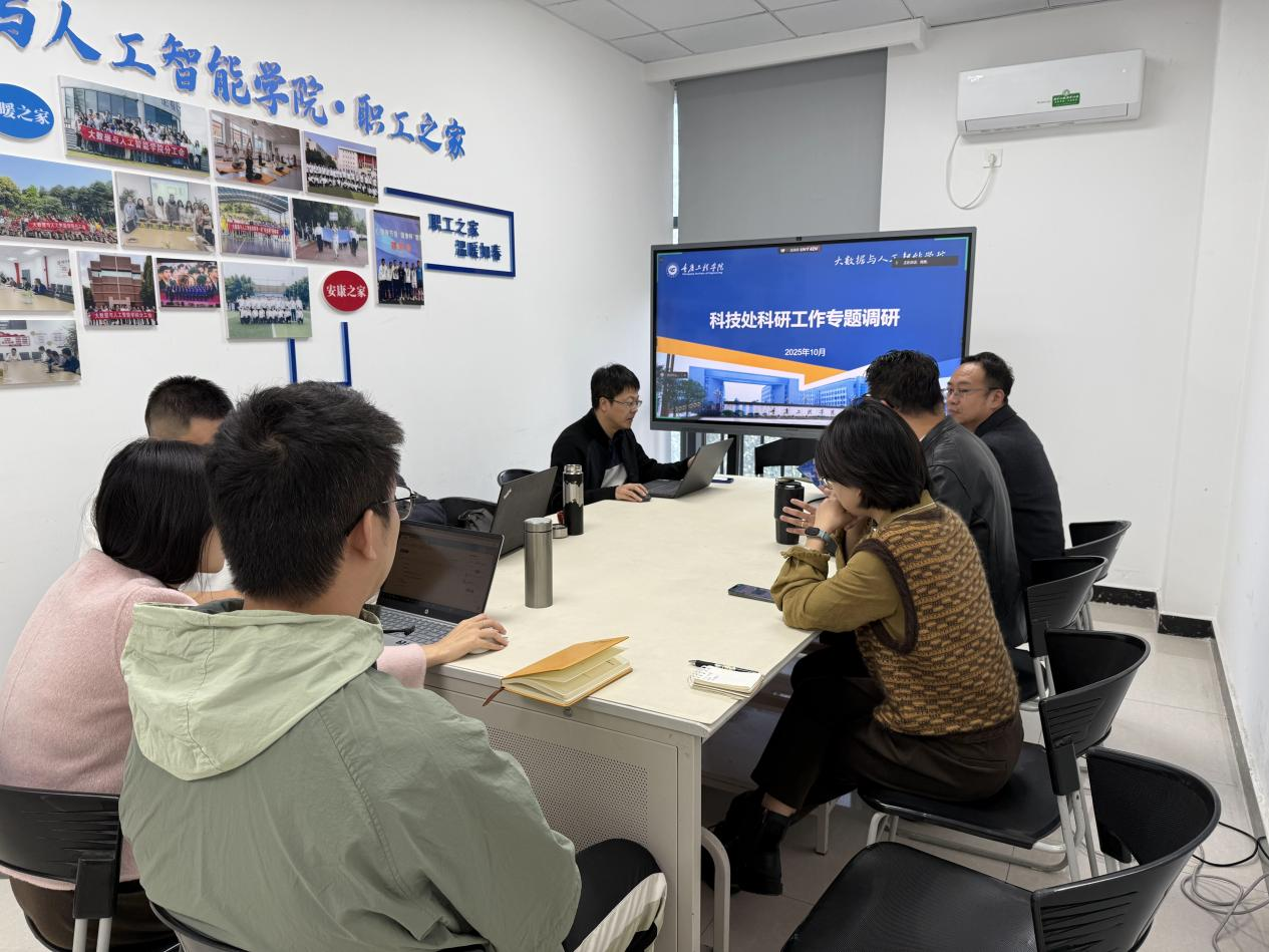 本网讯(文/图 大数据与人工智能学院 周勇)为深入推进学校科研工作高质量发展,10月28日上午,科技处副处长汪俊良深入大数据与人工智能学院开展专题调研。调研座谈会在7212会议室举行,学院院长李钦、科研副院长周勇、柏森教授、李波教授及慕江林等科研骨干教师共同参会。