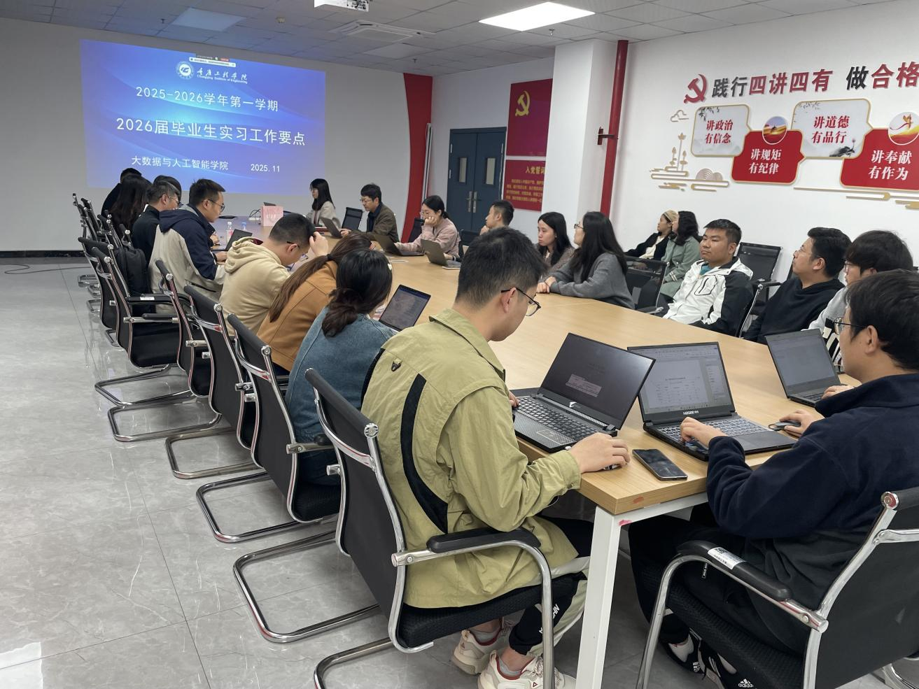 本网讯(图/文 大数据与人工智能学院 付霞)为规范毕业实习过程管理,提升学生实践能力与职业素养,保障2026届毕业生实习工作有序开展,大数据与人工智能学院按照《重庆工程学院教务处关于做好2026届毕业生实习工作的通知》(教函〔2025〕155号)、《重庆工程学院毕业实习管理办法(修订)》(渝工程院教〔2020〕63号)、《大数据与人工智能学院毕业实习管理实施细则(试行)》要求,于11月5日14:10时,在南泉校区7211会议室召开2026届毕业生实习工作专题会。学院全体毕业实习指导老师及毕业班辅导员参会,会议由教务科付霞主持。