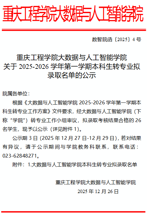 大数据与人工智能学院关于2025-2026年第一学期本科生转专业拟录取名单的公示