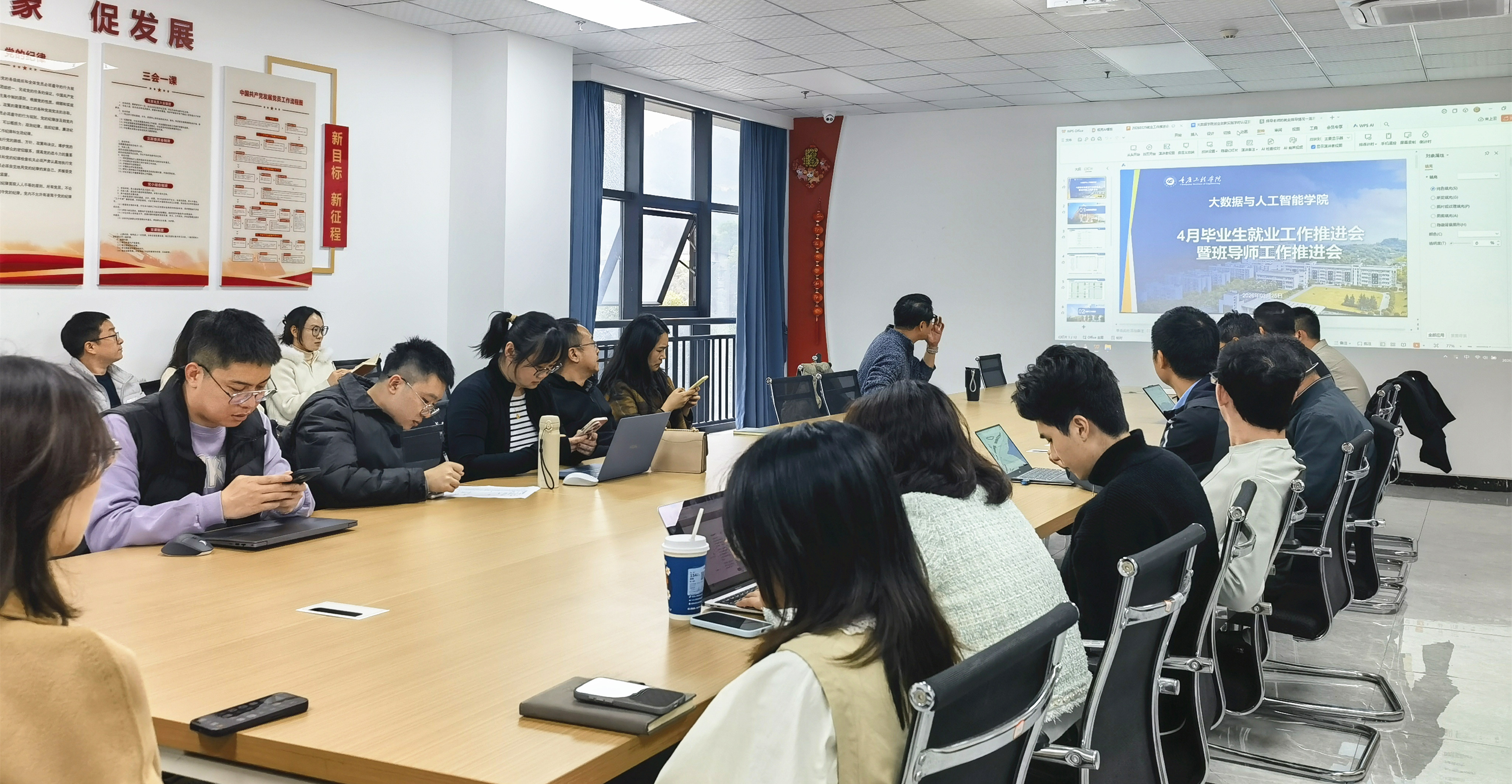 本网讯(文/图 大数据与人工智能学院 敬夫)3月25日,大数据与人工智能学院在7205召开4月就业工作推进会暨班导师工作推进会,全院班导师、论文指导老师和毕业班辅导员参会。