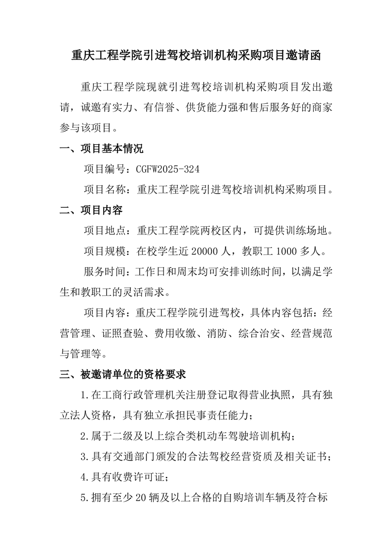 重庆工程学院引进驾校培训机构采购项目邀请函