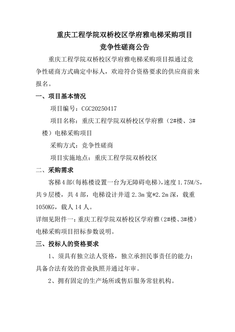 双桥校区学府雅电梯采购项目竞争性磋商公告