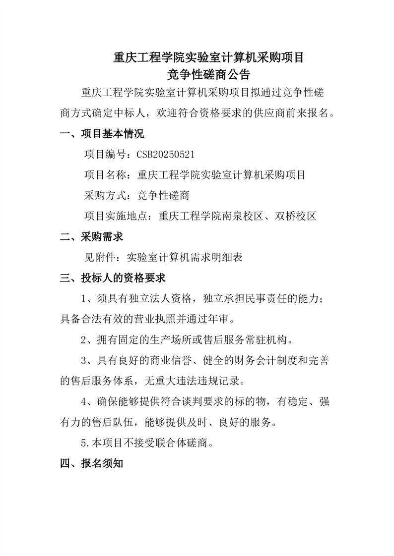 重庆工程学院实验室计算机采购项目竞争性磋商公告