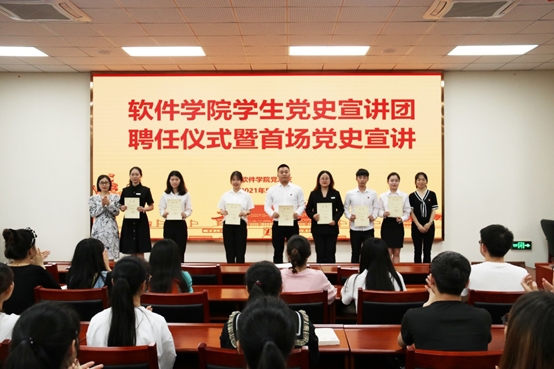 在庆祝中国共产党成立100周年之际,软件学院党总支组建了“学生党史宣讲团”,从青年学生视角出发,深入校园、社区开展党史宣讲,讲好党的百年辉煌故事。5月18日下午,“软件学院学生党史宣讲团聘任仪式暨首场党史宣讲”在新办公楼201会议室举行。软件学院党总支书记刘子菱出席了仪式,学院学生党支部发展对象、党员及党史宣讲团成员共百余人参加活动。