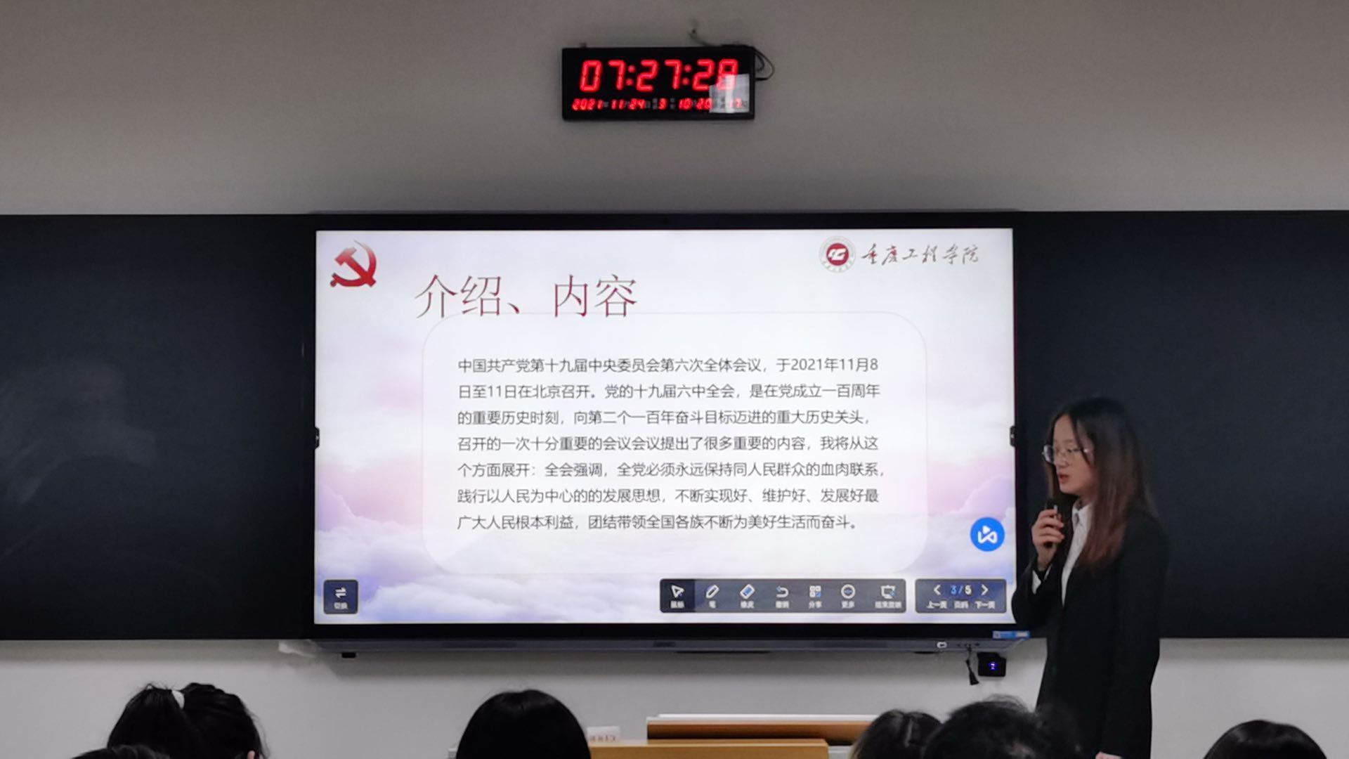 2021年11月24日上午,管理学院学生党支部在第六教学楼开展了“大学生微党课”党员演讲进班级活动之时政热点分享。8名2019级预备党员走进晨课课堂,向2020级的同学们进行宣讲。