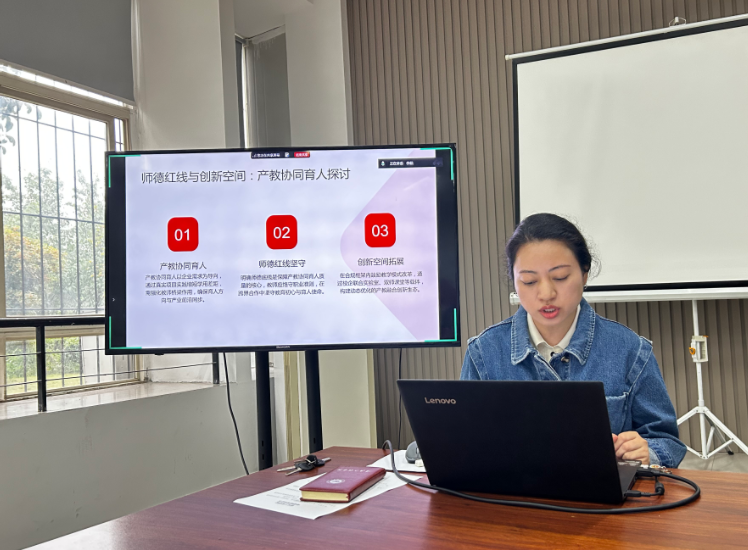 教学副院长弋玮玮以《产教协同育人中的师德红线与创新空间》为题作主题报告,结合校企合作案例,剖析师德规范与教育创新的平衡点,强调“守住底线才能拓展边界”。设计系聂太良老师、动画系罗能凤老师作为优秀教师代表,分享了课程思政融入专业教学、以爱育人的生动实践。聂太良提到:“在数字设计课程中融入传统文化元素,既是专业传承,更是价值观引导。”罗能凤则通过“师生共创动画短片”的案例,展现了学术诚信与团队协作的育人价值。