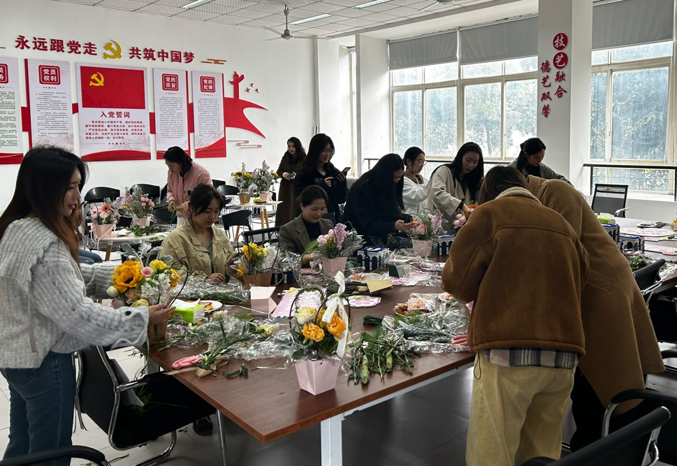 上午10时,活动在“指尖绽放,艺韵芳华”手工花束DIY体验中拉开帷幕。学院为教职工准备了鲜花、包装纸及创意手提袋等材料,鼓励大家发挥艺术创意,将自然之美与匠心巧思融入作品。活动现场花香四溢,欢声笑语不断,一束束独具匠心的花束不仅传递了对青春永驻的美好期许,更展现了女教职工们对生活的热爱与艺术追求。参与教师罗某某表示:“在忙碌的教学工作中,这样的活动让我感受到学院的关怀,也让我重新发现了手工创作的乐趣。”