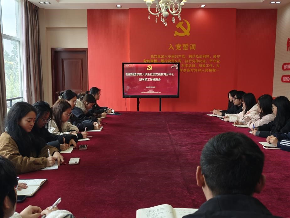 本网讯(文/图 余浩/徐汾淑)为进一步加强大学生党员实践教育分中心建设,根据学校党委组织部拟定的《学生党员学风带头行动实施办法》要求,结合学院学风推进举措和学生职业能力提升办法,扎实推动党员实践教育各项工作落地落实,智能制造学院大学生党员实践教育分中心于3月18日在办公楼二楼党员活动室召开新学期工作推进会。智能制造学院专职组织委员文列焰、部分学生党员代表及分中心全体成员参加。