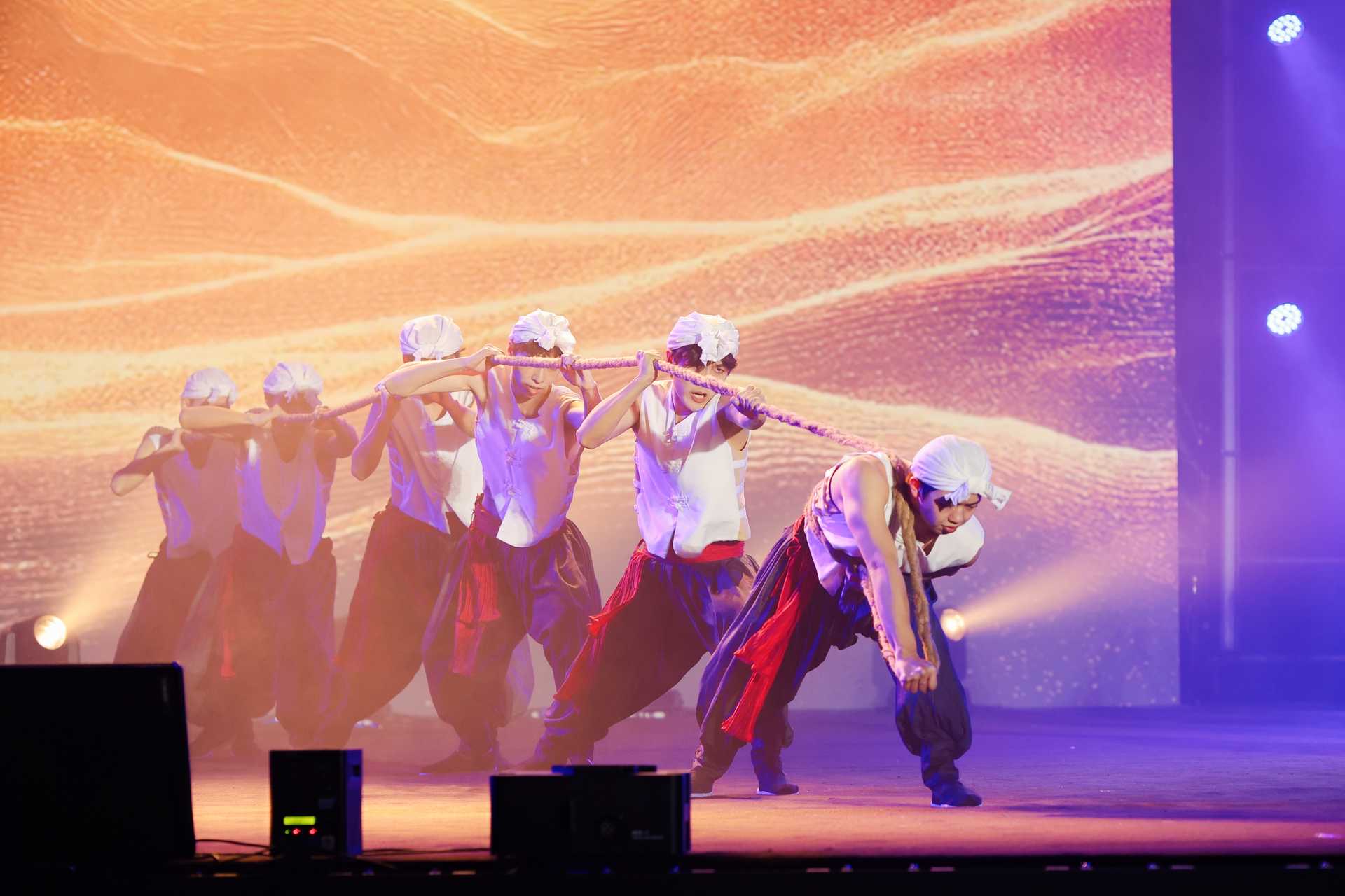 我校有幸受邀参与本次开幕式演出。钟定均、吴文红两位老师一展歌喉,喊出川江号子激昂的旋律,歌声中仿佛能听见滔滔江水奔腾不息,而我校大学生艺术团的同学则以节奏明快的律动为两位老师伴舞,生动再现了川江船工拼搏奋进的劳动场景,传递出不畏艰难、勇往直前的精神力量。节目凭借精彩呈现,展现川渝人民拼搏的精神,成为开幕式上的一大亮点,赢得了现场观众的高度赞誉与广泛好评。