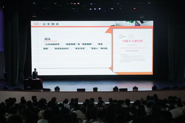 培训第八讲,王欢老师以《公文写作的实战技巧》为题。针对学生骨干在撰写通知、策划案、汇报材料时常见的逻辑混乱、表述冗杂等痛点,王欢老师以校园日常公文为范本,从标题吸睛凝练的 “点睛之笔”,到正文层次分明的 “黄金架构”,再到语言简洁规范的 “打磨技巧”,层层递进传授写作秘诀。王欢老师强调:“公文是工作的‘无声发言人’,规范专业的写作能让信息传递更高效、工作推进更顺畅。”