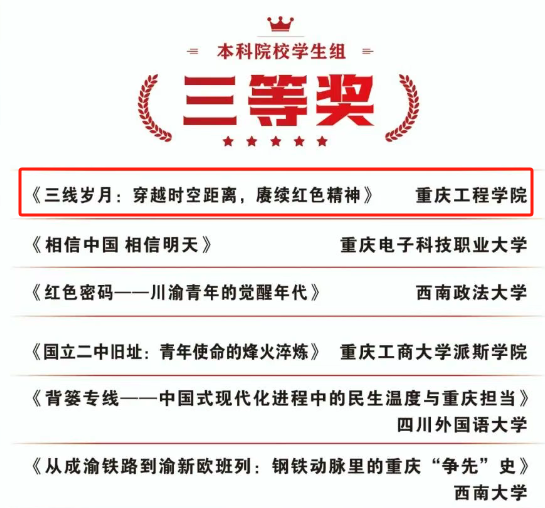 本次大赛吸引了川渝地区60余所高校千余名师生参与。我校计算机与物联网学院选送作品《红岩密码》在罗桓、尤洋、郝恬等教师精心策划与亲情演出下,以生动鲜活的舞台剧形式诠释红岩精神,荣获本科教师组二等奖。双桥校区学生团队创作的《三线岁月:穿越时空距离,赓续红色精神》(指导教师:杨双溢)通过情景演绎再现三线建设历史,荣获本科学生组三等奖。两件作品紧扣红色文化主题,以青年视角传承革命精神,赢得评委高度评价。