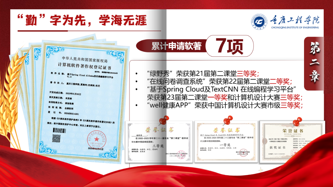 从院赛到国赛,从第一次参加重庆市级程序设计竞赛时的意外获奖,到后来频频站上更大的舞台,她用一次次尝试实现了从青涩到成熟的蜕变。这三年来,她累计获得了58项竞赛奖项,其中国家级3项、市级10项。作为威扬工作室成员,她与团队开发了“绿野秀”“编程学习平台”等创新项目,累计申请软件著作权7项。