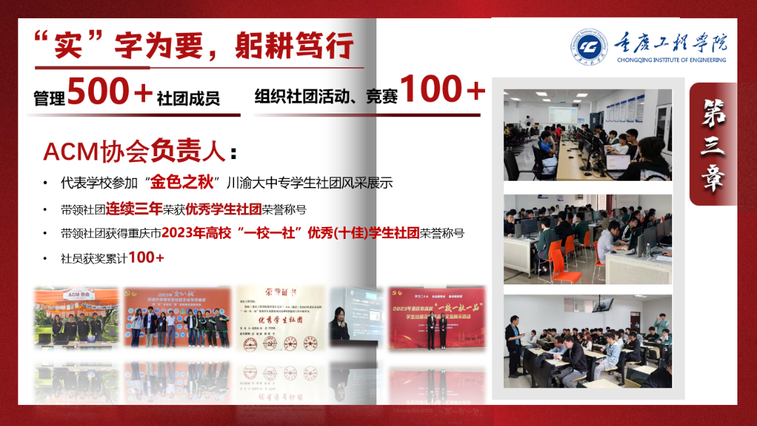 作为班长,她用踏实的行动温暖了每一个同学。她组织学习互助小组,搭建成长平台,鼓励大家共同进步;作为ACM社团负责人,她策划百余场校内外活动,带领团队连续三年荣获“优秀学生社团”称号,并在2023年荣膺重庆市“一校一社”十佳社团的殊荣。这些经历,不仅成就了团队,也让她在责任中成长。