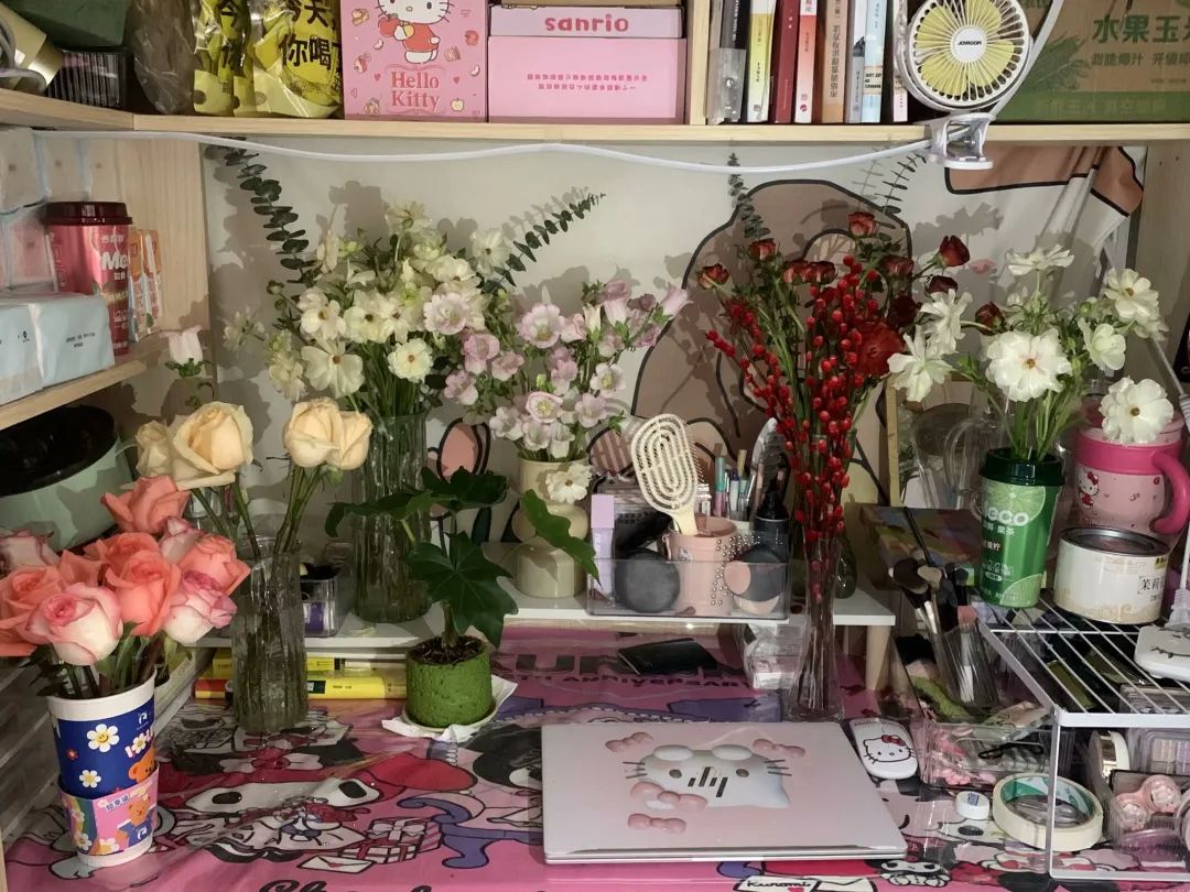 推开宿舍门,书桌上缤纷的花束闯入我们的视线范围。粉色玫瑰在卡通杯里绽放,透明花瓶中淡黄色玫瑰与白色小花相映成趣,连绿植都点缀着生机。在这样的书桌前学习,笔尖仿佛都沾着花香。