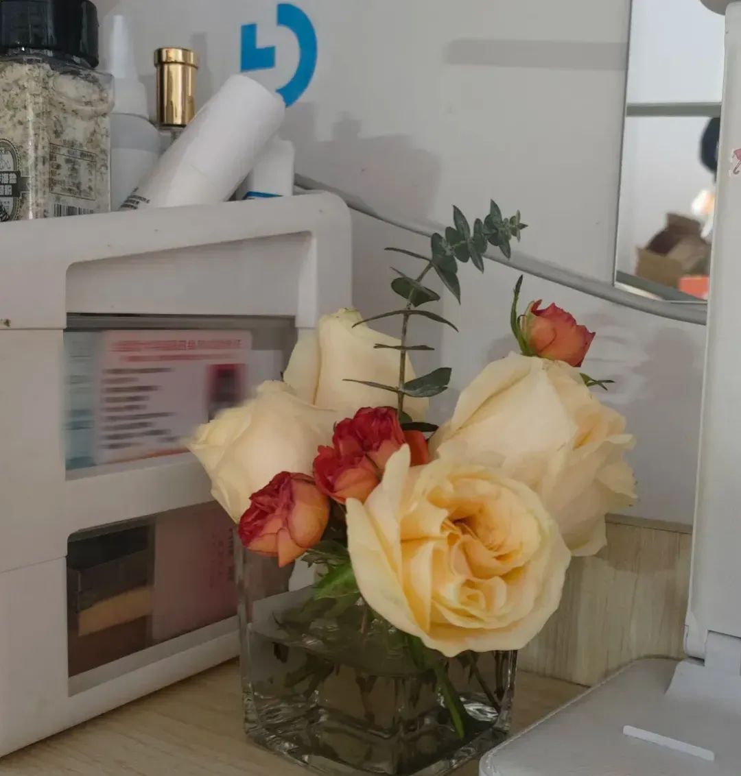 当洗漱台不再单调,白色玫瑰搭配小雏菊,洗漱便成了享受;阳台的玻璃花瓶里,蓝白小花与渐变色玫瑰共舞,阳光洒下时,每一片花瓣都在讲述岁月静好。这些花,是生活的诗意注脚,让宿舍每个角落都浸润着温柔。