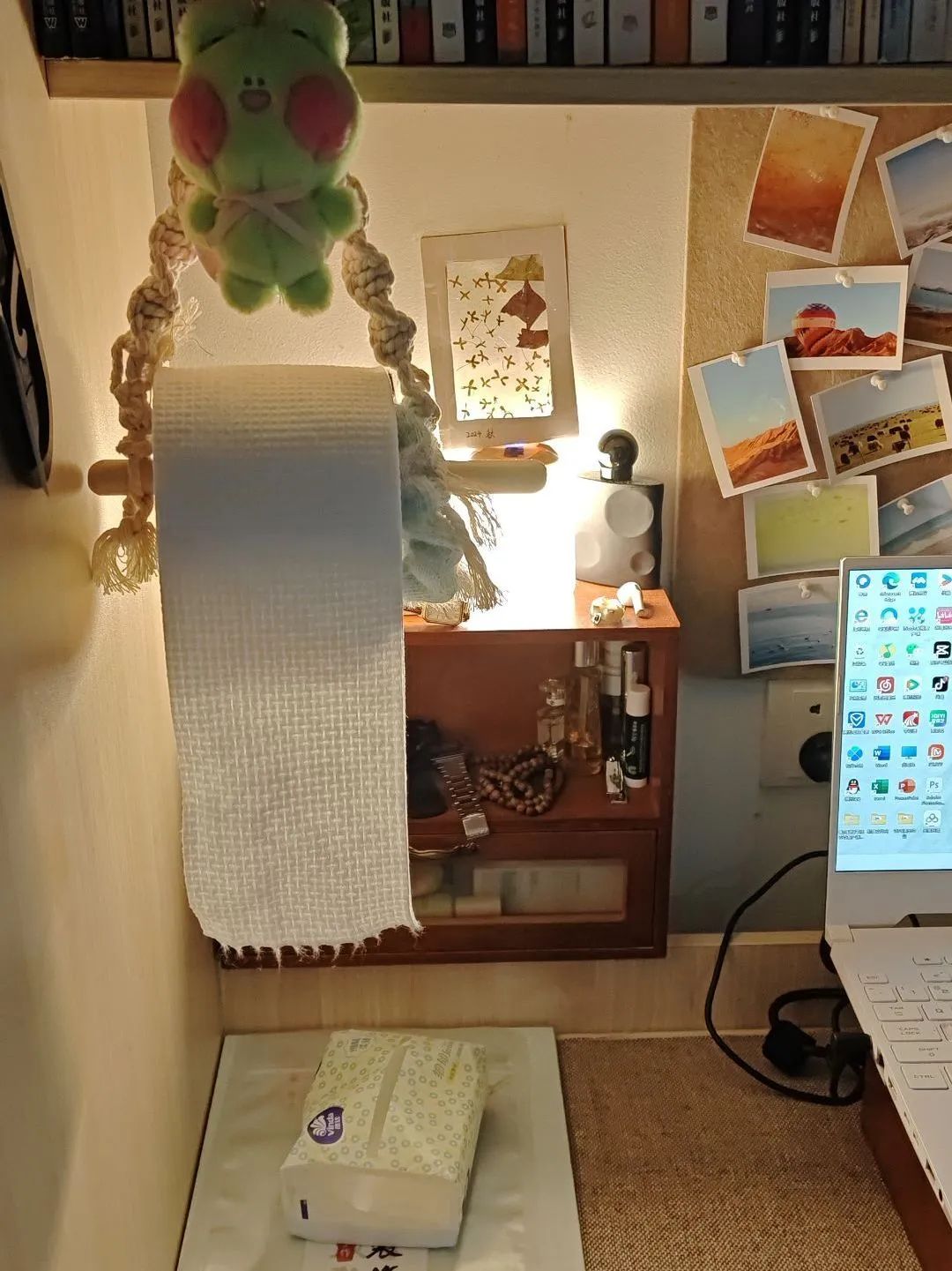 连纸巾架都有青蛙玩偶守护,当学习疲倦时,抬头看见这些可爱的 “小伙伴”,疲惫瞬间消散。它们不仅是装饰,更是深夜畅聊时的倾听者,是独处时的温暖陪伴,让宿舍充满家的温度。