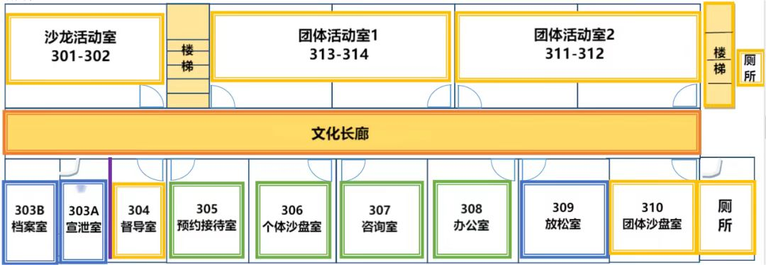 重庆工程学院心理中心坐落在南泉校区大学生服务中心3楼和双桥校区办公楼5楼,总面积达760余平方米,功能房共计21间。包括个体咨询室4间,团体辅导室3间,沙龙活动室1间,心理沙盘室3间,宣泄室2间,音乐放松室1间,督导室1间,办公室2间,档案室1间,预约接待室+阅览室1间。