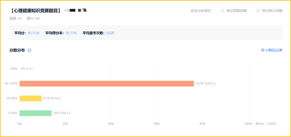 心理健康线上知识竞赛内容涉及心理健康教育、校内求助资源、心理学效应、心理疾病、朋辈帮扶方法等部分知识,共设置单选、多选、判断等多种题型,满分100分。共吸引了4255人进群围观,最终参加活动3699人,其中得分达到89分及其以上的有1712人。此次线上心理知识竞赛有效夯实了学生的心理健康知识基础,显著提升了同学们的自我关怀与互助支持的意识,为促进学生的健康成长与全面发展筑牢了根基。