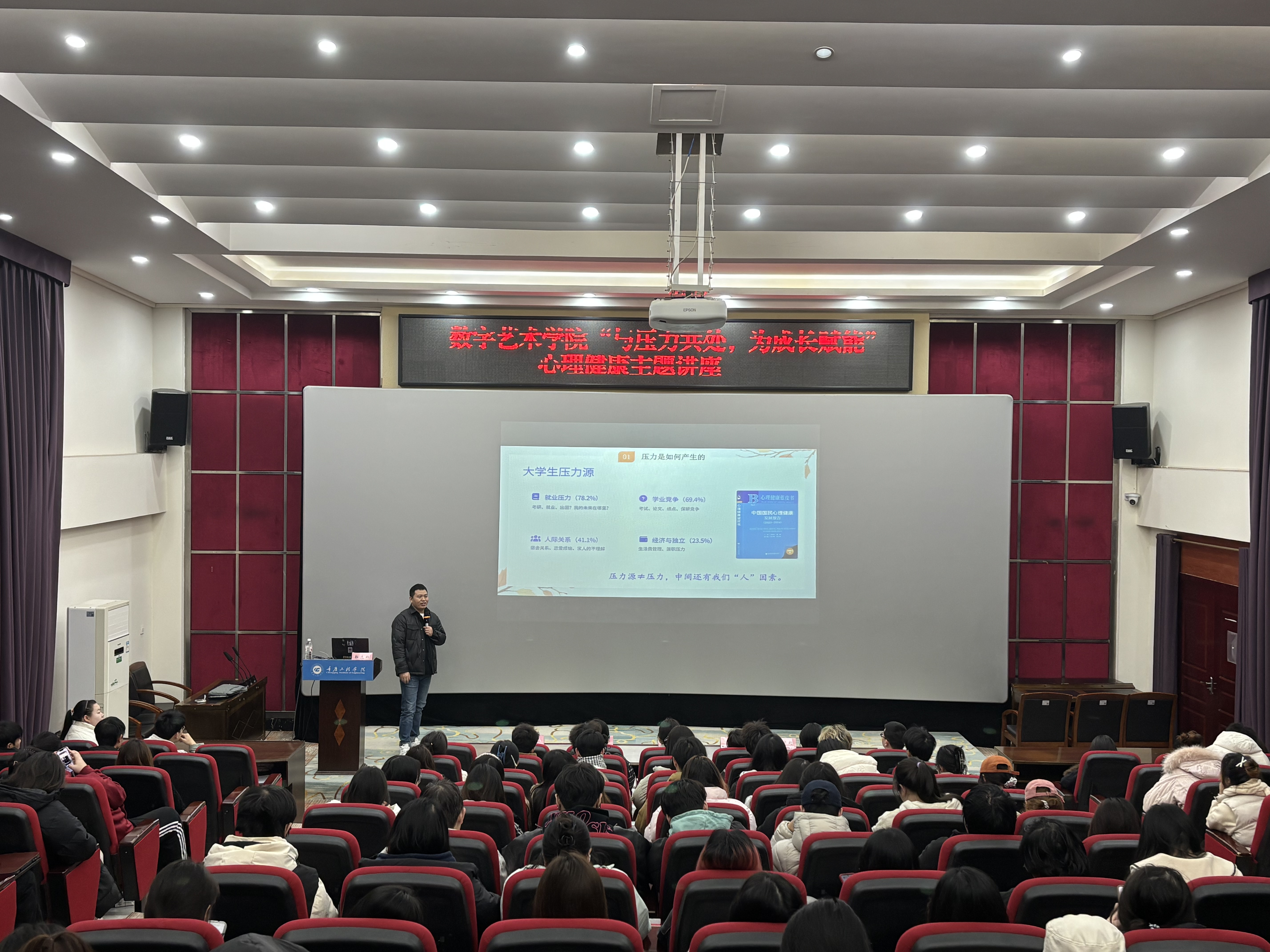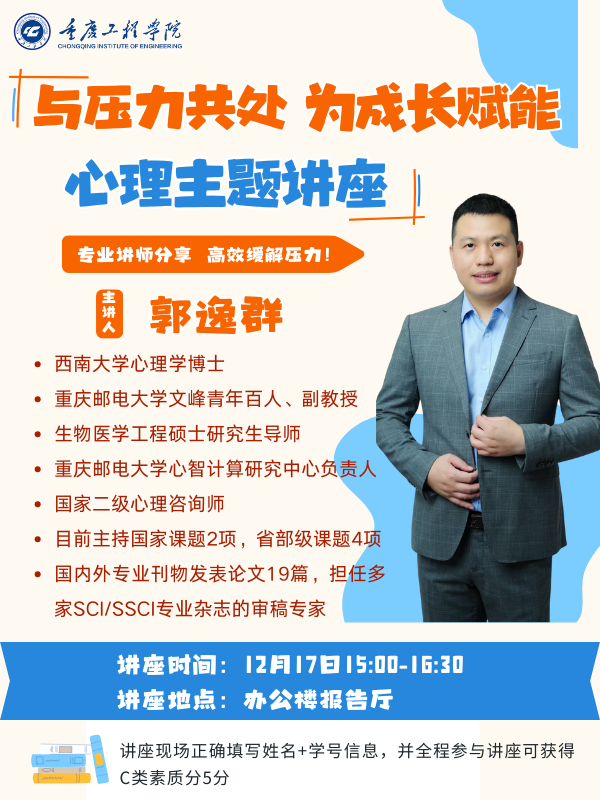 临近期末考试,为帮助学生科学应对学业压力,提升心理调适能力,12 17 15:00,在办公楼报告厅成功举办 “与压力共处,为成长赋能” 心理健康主题讲座。本次讲座特邀重庆邮电大学文峰青年百人、副教授郭逸群博士担任主讲人,现场200余名学生参与,氛围热烈而专注。​