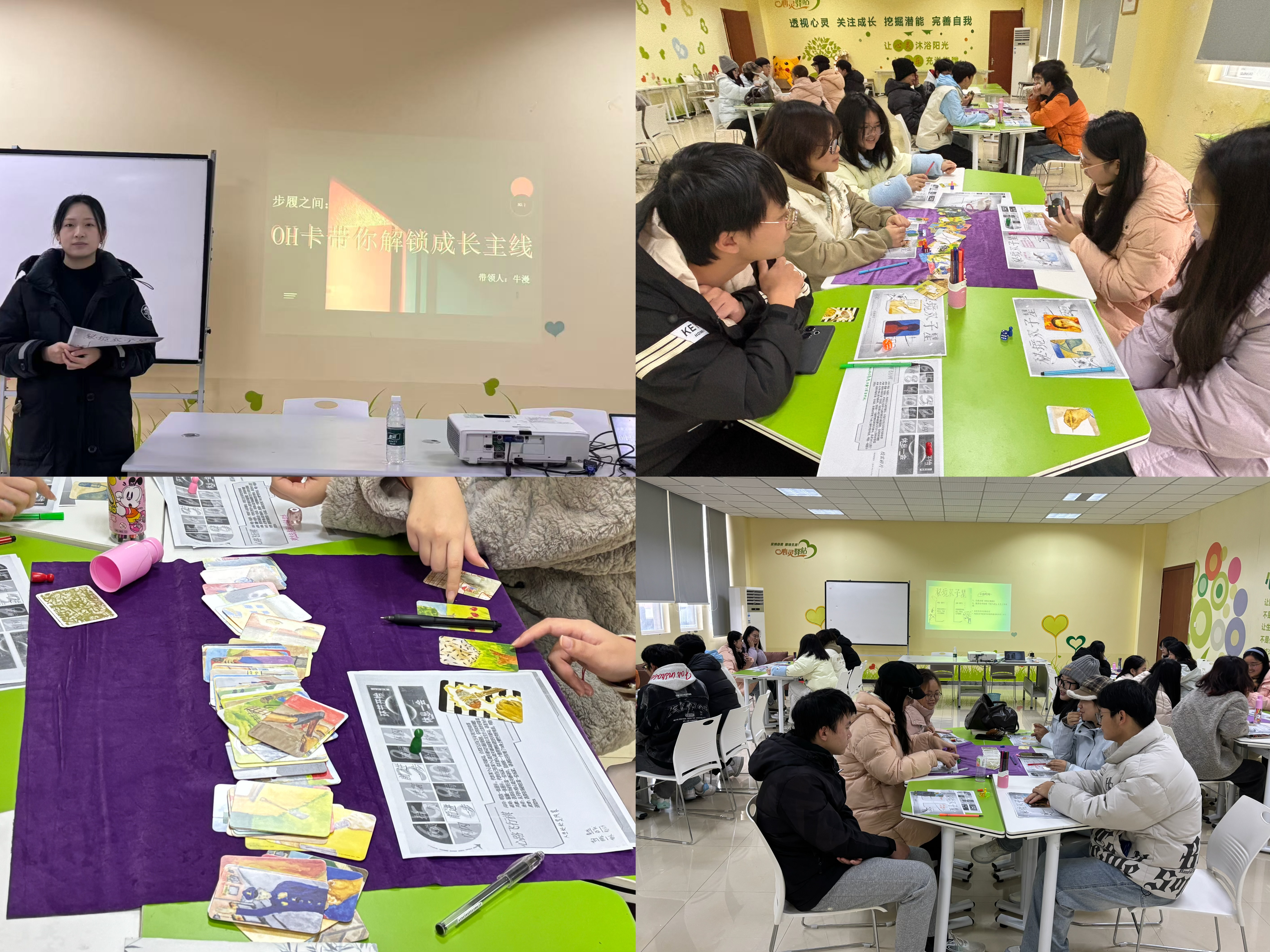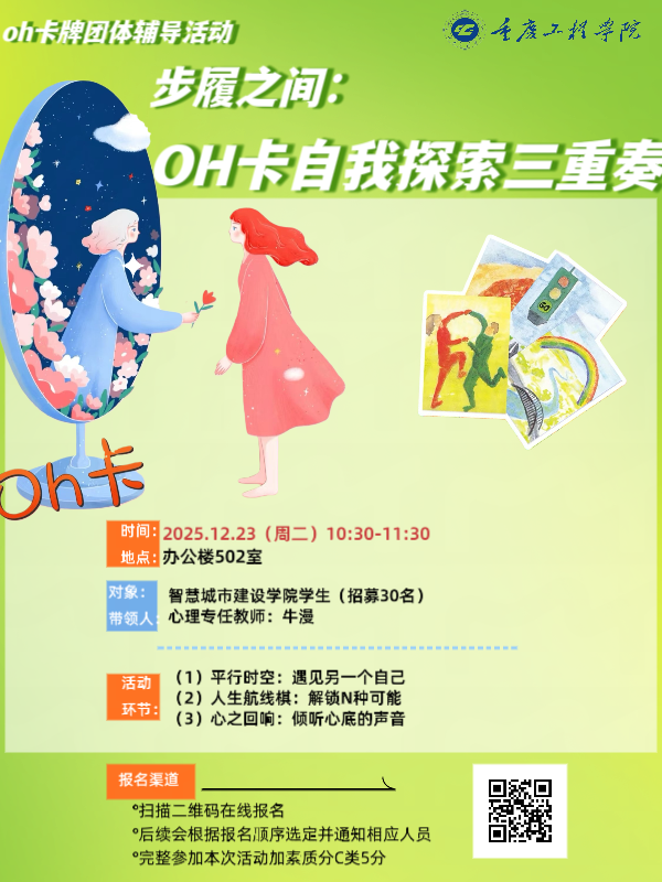 为帮助同学们深化自我认知,明晰成长方向,解锁专属成长主线,同时掌握“线索思维”,敏锐捕捉生活中指引成长的各类“信号”,2025年12月23日上午10点30分,心理健康教育与咨询中心开展了“步履之间:OH卡成长探索三重奏”团体心理辅导活动。本次活动由心理专任教师牛漫带领,智慧城市建设学院28名同学参与其中。