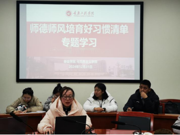 本网讯(文/图马克思主义学院 刘爽 )为进一步加强教师职业道德建设,提升教师队伍整体素质,马克思主义学院于12月31日在南泉校区第三会议室组织开展“师德师风培育好习惯清单”专题学习,由马克思主义学院书记王巧玲领学,全体教师参加。