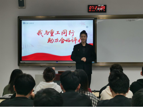 在学校迎评之际,为发挥支部党员的模范带头作用,践行“我为评估做贡献”,软件与人工智能学院学生第三党支部于10月28日在第六教学楼开展了“我与重工同行,助力合格评估” 专题活动。支部全体学生党员和预备党员参加。
