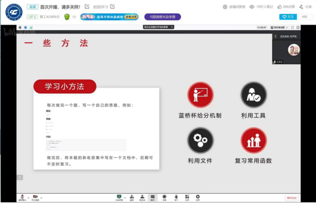 (文/图 软件与人工智能学院 陈彬) 11月19日晚,“码上行动,等你上场”蓝桥杯讲座在哔哩哔哩直播平台上顺利举行。本次活动由软件与人工智能学院主办,ACM协会承办,指导老师彭娟及多次获奖的任予菲同学主讲,累计1855余人次参加。