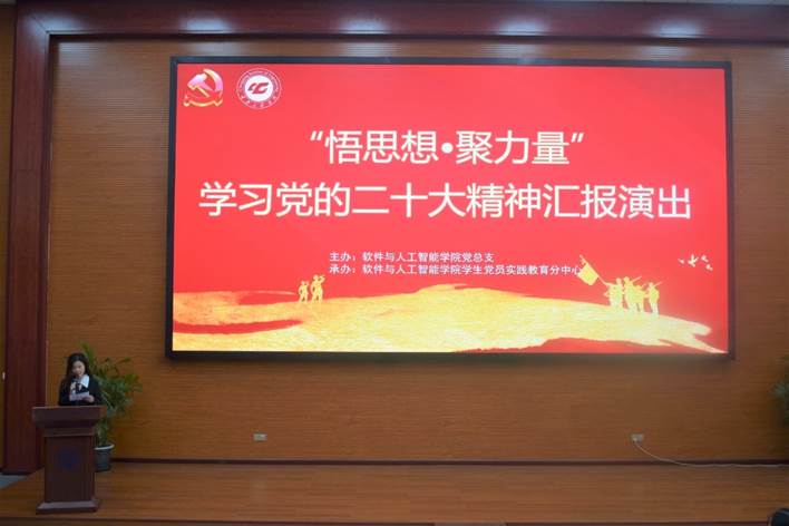 本网讯(文/王瑞浩 图/软件与人工智能学院)为认真学习贯彻党的二十大精神,继承和发扬党的优良传统和作风,11月26日,软件与人工智能学院党总支在信息大楼报告厅举行“悟思想·聚力量”学习党的二十大精神汇报演出。