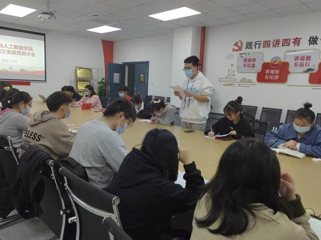 本网讯(文/王瑞浩 图/软件与人工智能学院)为进一步做好党员发展工作,扩充学生党员队伍,激发支部党员活力,软件与人工智能学院学生第三党支部于11月22日召开党员大会,讨论关于吸收费玉霖等6名同志为中共预备党员事宜。会议由支部书记王芳同志主持,支部全体党员和预备党员参加。