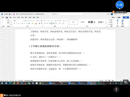 (文/图 软件与人工智能学院 石磊)为了做好专业分流工作,让同学们了解专业分流方案,12月5日晚,数字媒体技术专业开展2020级专业分流线上讲座。讲座由系主任石磊主持,数字媒体技术专业2020级全体同学参加。