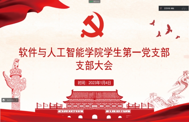 (文/马人和 图/软件与人工智能学院)2023年1月4日,软件与人工智能学院学生第一党支部召开线上支部大会,讨论王泓妤等7名同志预备党员转正,吸收童成澄同志为预备党员的问题。本次大会由党支部书记王薇同志主持,支部全体党员和预备党员参加。