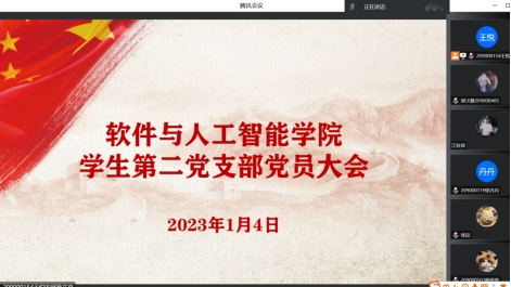 (文/图 软件与人工智能学院 胡才静)为进一步做好党员发展工作,激发支部党员活力,软件与人工智能学院学生第二党支部于2023年1月4日线上召开了党员大会,讨论张欣等6名预备党员同志转正事宜。会议由软件与人工智能学院学生第二党支部书记余巧主持,支部组织委员李霜、李阳、王惠俊、縢攀以及支部学生党员共计50余人参加。