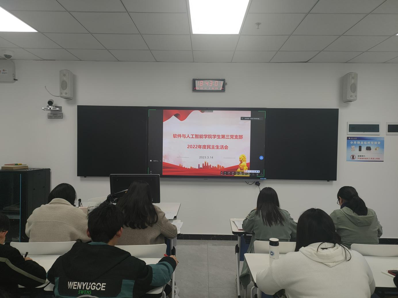 (文/图 软件与人工智能学院 钟欣桐/王瑞浩)3月14日,软件与人工智能学院学生第三党支部于在7206教室开展了2022年度基层党组织生活会及民主评议党员大会。本次会议由支部书记王芳主持,全体党员线上+线下共同参与。