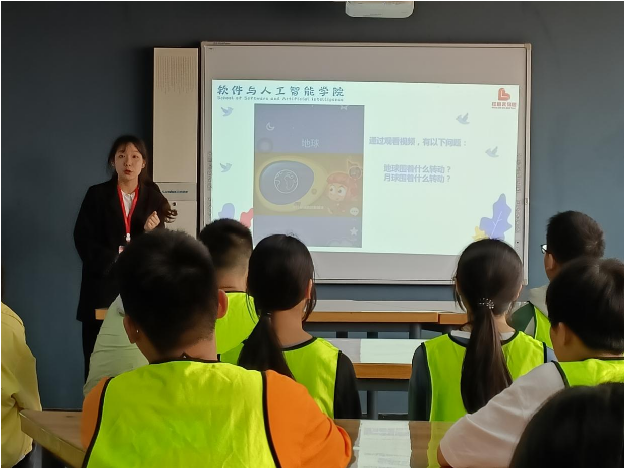 支教小老师颜芮以编程的由来小视频开展,唤醒学生们对编程的好奇心,接着给学生们普及了几种常用的编程语言,及Scratch。随后,支教小老师用地球自转地理常识视频及图解,引入本节课主题“Scratch旋转的地球”,从主题项目、编程逻辑、运用公式、选择模块等相关基础知识等方面进行讲解,让同学们在学习了一定的基础知识后,带领同学们进行项目演练,培养同学们仔细思考、动手实践的能力,鼓励大家在课堂中主动积极地尝试,让同学们在课堂中收获编程技巧与知识,培养编程兴趣。
