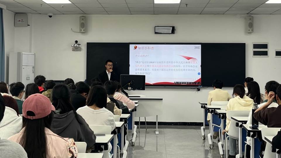 本次党日活动分为四个流程。首先,高森同志领学两会精神内涵。接着,张怡鑫和张林同志作为小组代表分享两会学习心得。随后,进行“两会知识我知道”抢答题活动。最后,组织委员任灿同志总结发言,她对同志们的两会相关主题的分享提出了建议和意见,强调不仅要宣传贯彻两会精神,更要号召群众学习。她指出,两会是国家政治生活的重要组成部分,也是青年学生了解国家大事、参与国家建设的重要途径。同学们应认真聆听两会“关键词”,深入领会两会精神内涵,为国家发展贡献青春力量。