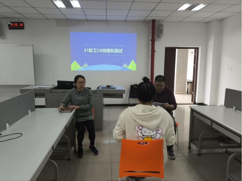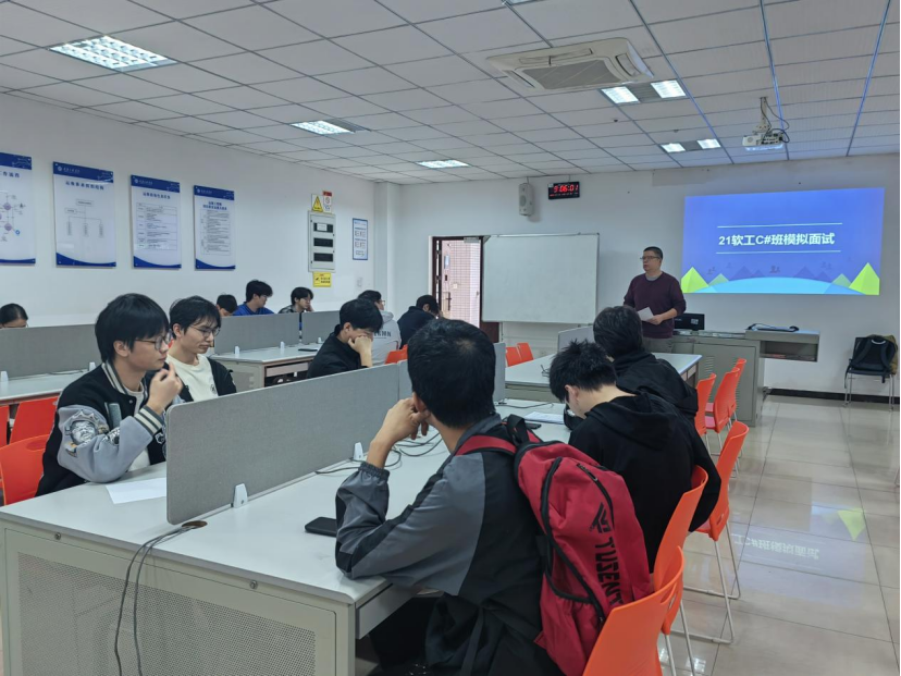 本网讯(文/图 软件学院 胡丹萍)为帮助同学们提升自我表达能力,增强面试技巧,为未来求职路上提供有力支持,21级软件工程C#班于11月5日上午在4404教室开展了模拟面试活动。本次活动由实训指导老师江泽锋、辅导员胡丹萍主持,21级软件工程C#班在校同学参加。