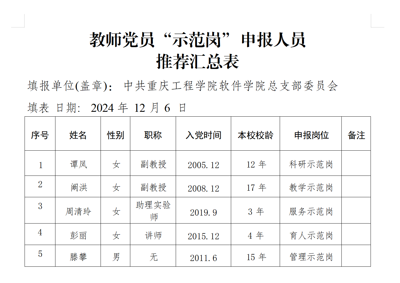 根据校党委《关于组织开展 2024年教师党员“ 示范岗”推 荐工作的通知》的要求,经过教职工党员推荐、相关负责人讨论、 党总支委员审议等工作流程,拟定谭凤同志为“ 科研示范岗” 推荐 人选、阚洪同志为“教学示范岗”推荐人选、周清玲同志为“ 服务示 范岗”推荐人选、彭丽同志为“ 育人示范岗” 推荐人选、滕攀同志为 “ 管理示范岗” 推荐人选。