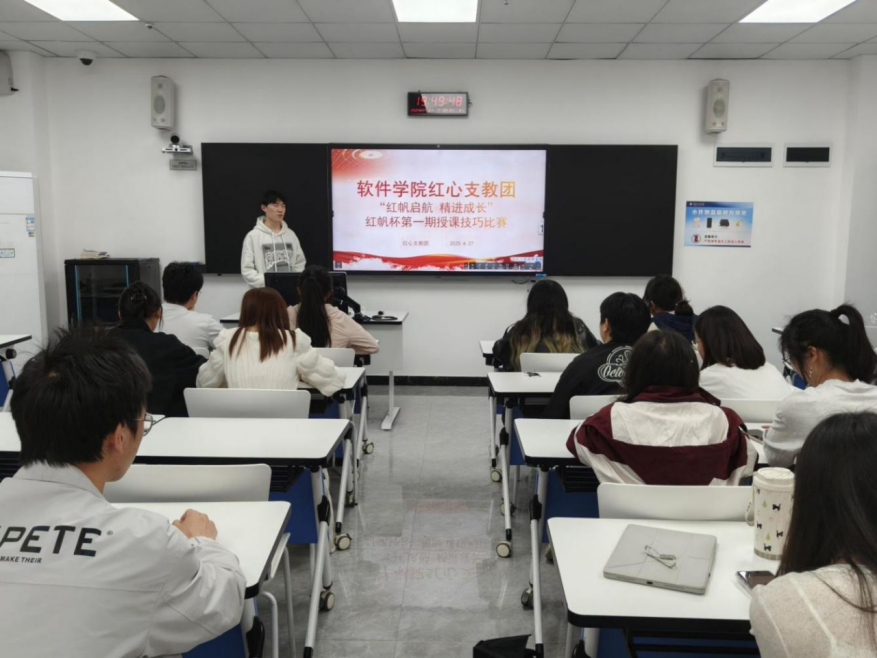 本网讯(文/图 软件学院 潘俊/孙洪萍)为了提升支教团成员授课能力,将思政内容更好融入课程,潜移默化树立正向价值观,软件学院红心支教团于2025年4月27日在7310教室成功举办“红帆求索,精进成长”第一期授课技巧比赛活动,此次活动由红心支教团全体成员共同参与。