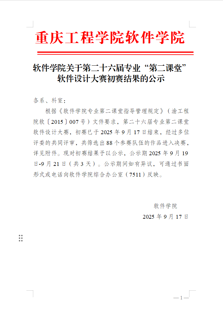 软件学院关于第二十六届专业“第二课堂”软件设计大赛初赛结果的公示