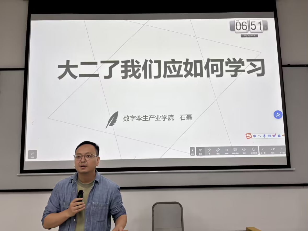 (数字孪生产业学院 图/文 付浪)2025年10月14日晚,数字孪生产业学院数字媒体技术专业于6204教室开展“大二学习方法指导”专业宣讲会。专业系主任石磊、辅导员胡丹萍及2024级全体数字媒体技术专业学生参与。