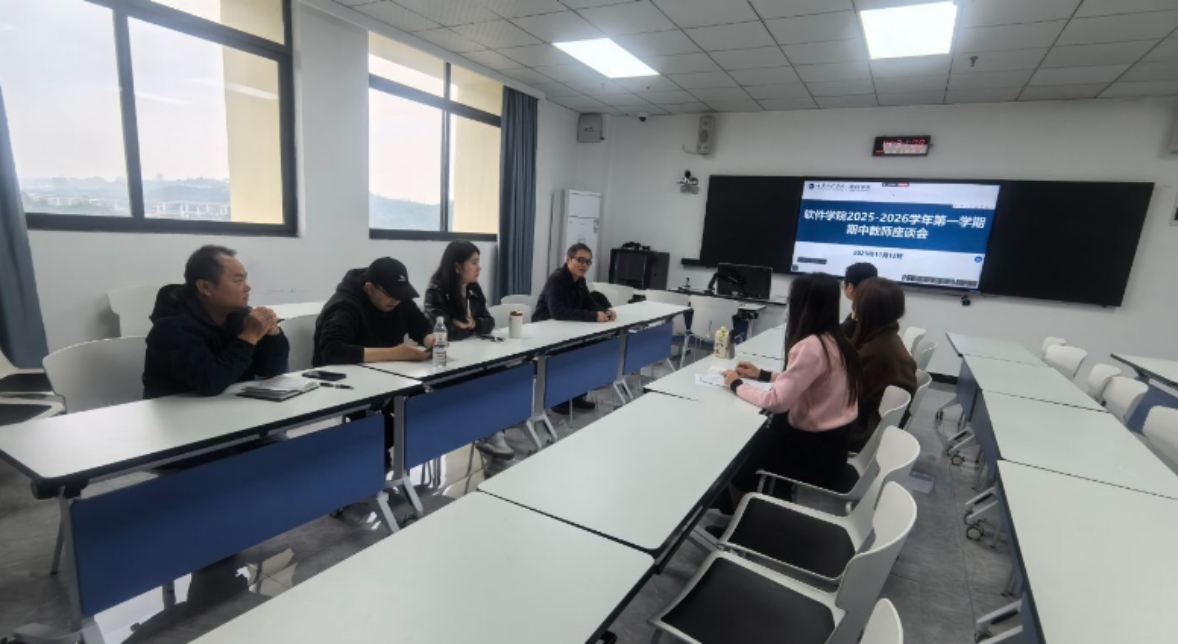 (文/图 软件学院 梁书娟) 为精准掌握教学动态,倾听教师教学诉求,持续优化教学管理与人才培养工作,软件学院于 2025年11月12日下午召开期中教师信息座谈会。教学副院长唐浩坤、教务科长张红实,以及软件技术教研室、软件工程训练中心、公共技术教研室选派的教师代表共同参会,围绕教学中的重点难点问题深入交流。