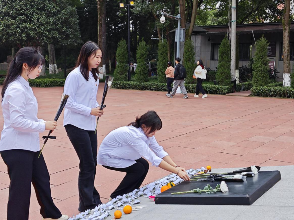 活动伊始,肖雪琴同志详细讲解了活动纪律要求与红岩精神的历史背景,为活动开展做好铺垫。队伍抵达歌乐山烈士陵园后,在红岩魂广场整队集结,随后,全体人员依次向“死难烈士之墓”敬献鲜花,驻足瞻仰烈士群雕与英名录,以肃穆的仪式表达对革命先烈的深切缅怀与崇高敬意。随后,在支部预备党员邓力同志的领誓下,全体人员面向党旗与烈士纪念碑重温入党誓词,将缅怀之情转化为对党忠诚的坚定承诺。