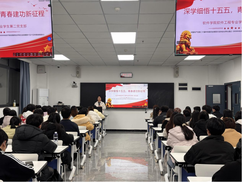 (文/图 软件学院 周楠/李正杰)为深入学习“十五五”规划的建议,引导学生党员把握国家发展战略布局,切实增强使命担当,软件学院软件工程专业学生第二党支部于11月26日在71202教室开展“深学细悟‘十五五’,青春建功新征程”主题党课。支部全体23级、24级学生党员、发展对象及入党积极分子共80余人参加。